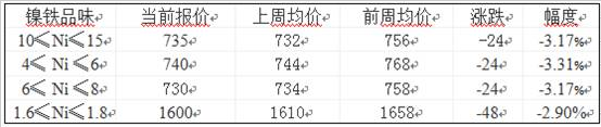 价格方面,10%≤ Ni ≤15%的高镍铁出厂报价725-735元/镍,上周均价732元/镍,较前周756元/镍的均价下跌24元/镍,跌幅3.17%;4% ≤ Ni ≤ 6%的中镍铁当前报价为740元/镍,上周均价744元/镍,较前周768元/镍的均价下跌24元/镍,跌幅3.31%;6% ≤ Ni ≤ 8%的中镍铁当前报价为730元/镍,上周均价734元/镍,较前周758元/镍的均价下跌24元/镍,跌幅3.17%;1.6% ≤ Ni ≤ 1.8%的低镍铁当前报价为1600元/吨,上周均价1610元/吨,较前周1658元/吨的均价下跌48元/吨,跌幅2.90%。